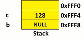"char *b = NULL"定义一个指针变量b,b的地址是0xFFF8,值为空—>运行到"b = (char*)malloc(1024*sizeof(char))"时才在堆中申请了一块内存(假设这块内存地址为0x77a0080)给了b,此时b的地址并没有变化,但其值变为了0x77a0080,这个值指向了一个堆空间的地址(栈变量的值指向了堆空间),这个过程b的内存变化如下: