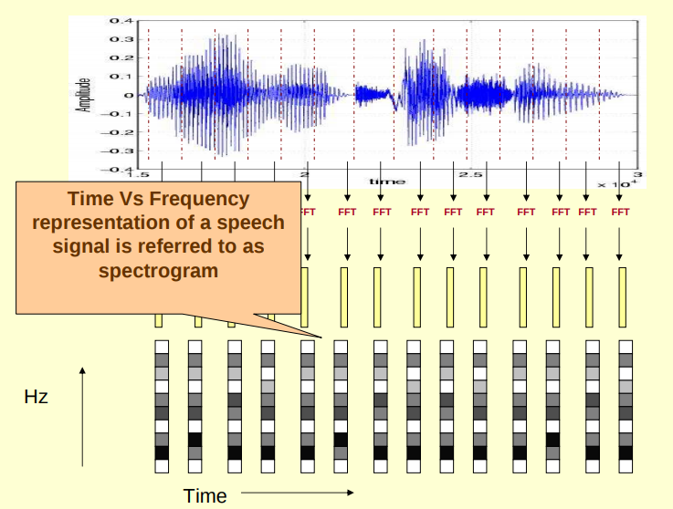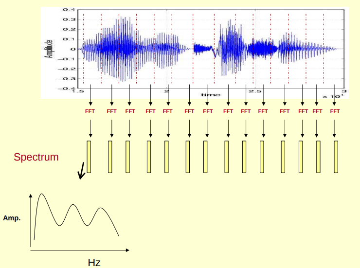 (1)对原始信号进行分帧加窗后,可以得到很多帧,对每一帧做 FFT(快速傅里叶变换),傅里叶变换的作用是把时域信号转为频域信号,把每一帧 FFT 后的频域信号(频谱图)在时间上堆叠起来就可以得到声谱图,其直观理解可以形象地表示为以下几个图,图源见CMU 语音课程 slides。