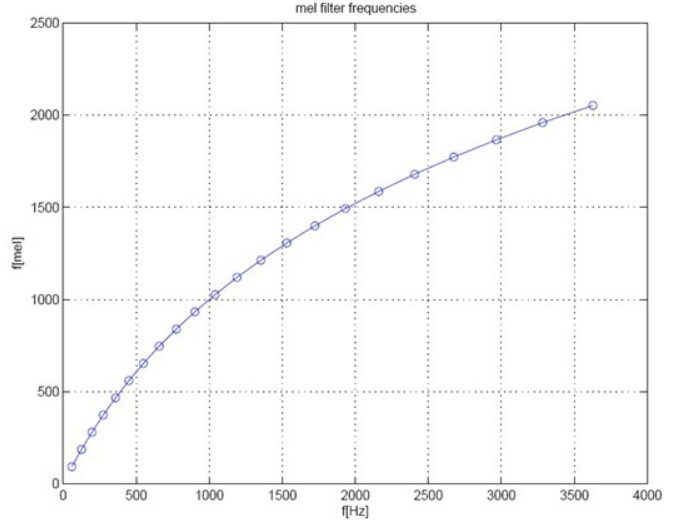 下图展示了梅尔频度-正常频度的对应关系,正如之前所说明的,低频段的部分,梅尔刻度和正常频度几乎呈线性关系,而在高频段,因为人耳的感知变弱,因此两者呈对数关系。