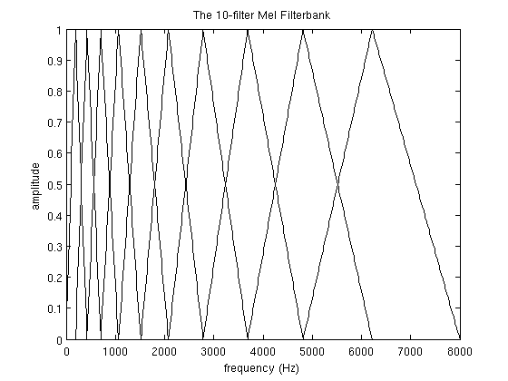 (6)然后创建滤波器,第一个滤波器从第一个点开始,在第二个点到达最高峰,第三个点跌回零。第二个滤波器从第二个点开始,在第三个点到达最大值,在第四个点跌回零。以此类推。滤波器的示意图如下图所示,图源见csdn-MFCC 计算过程。可以看到随着频率的增加,滤波器的宽度也增加。
