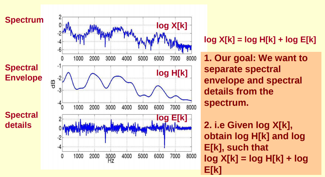 (3)然后再大致说说 MFCC 的含义,下图第一个图(图源见参考资料 [1])是语音的频谱图,峰值是语音的主要频率成分,这些峰值称为共振峰,共振峰携带了声音的辨识(相当于人的身份证)。把这些峰值平滑地连起来得到的曲线称为频谱包络,包络描述了携带声音辨识信息的共振峰,所以我们希望能够得到这个包络来作为语音特征。频谱由频谱包络和频谱细节组成,如下第二个图(图源见参考资料[1])所示,其中 log X[k] 代表频谱(注意图中给出的例子是赫兹谱,这里只是举例子,实际我们做的时候通常都是用梅尔谱),log H[k]代表频谱包络,log E[k]代表频谱细节。我们要做的就是从频谱中分离得到包络,这个过程也称为倒谱分析,下面就说说倒谱分析是怎么做的。