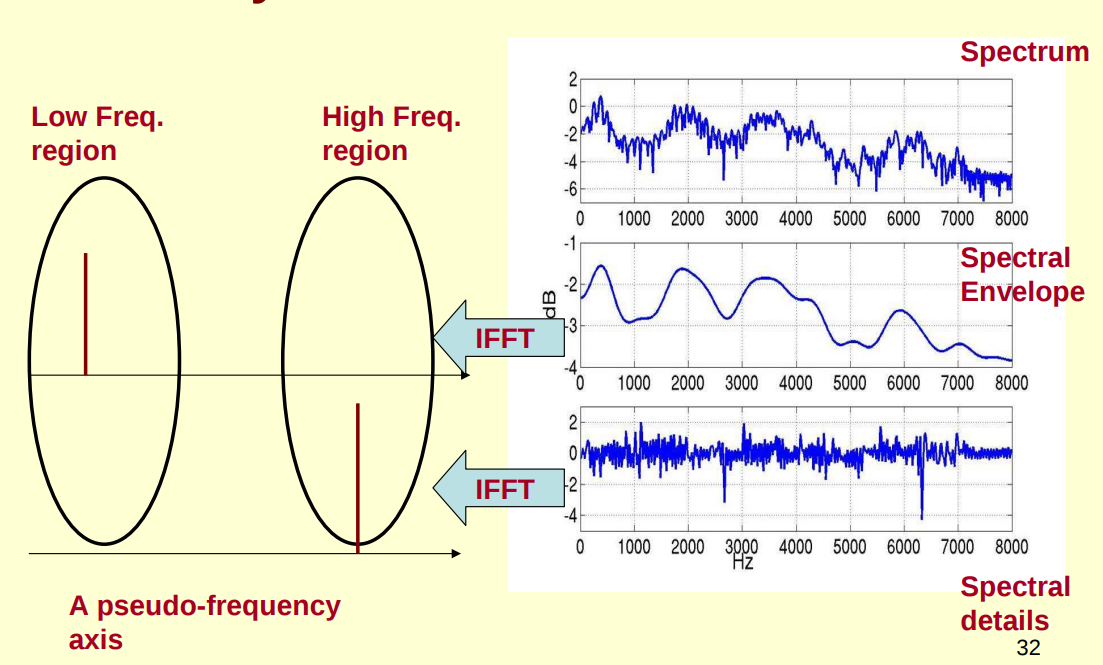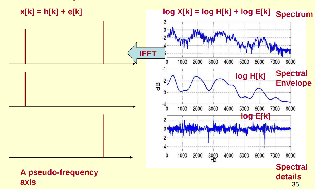 (4)要做的其实就是对频谱做 FFT,在频谱上做 FFT 这个操作称为逆 FFT,需要注意的是我们是在频谱的 log 上做的,因为这样做 FFT 后的结果 x[k]可以分解成 h[k]和 e[k]的和。我们先看下图(图源见参考资料 [1]),对包络 log H[k] 做 IFFT 的结果,可以看成 “每秒 4 个周期的正弦波”,于是我们在伪频率轴上的 4Hz 上给一个峰值,记作 h[k]。对细节 log E[k] 做 IFFT 的结果,可以看成 “每秒 100 个周期的正弦波”,于是我们在伪频率轴上的 100Hz 上给一个峰值,记作 e[k]。对频谱 log X[k] 做 IFFT 后的结果记作 x[k],这就是我们说的倒谱,它会等于 h[k]和 e[k]的叠加,如下第二个图所示。我们想要得到的就是包络对应的 h[k],而 h[k]是 x[k]的低频部分,只需要对 x[k]取低频部分就可以得到了。