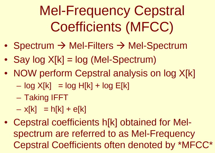 4.MFCC:对线性声谱图应用mel滤波器后,取log,得到log梅尔声谱图,然后对log滤波能量(log梅尔声谱)做DCT离散余弦变换(傅里叶变换的一种),然后保留第2到第13个系数,得到的这12个系数就是MFCC。