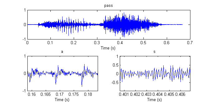 下面这张图中上方的子图,是读单词pass /pæs/的录音。它的横坐标已经被拉开了一些,但其实这个波形是由两个“三角形”组成的。0.05秒处那个小突起是爆破音/p/,0.05秒到0.3秒是元音/æ/,0.3到0.58秒是辅音/s/。