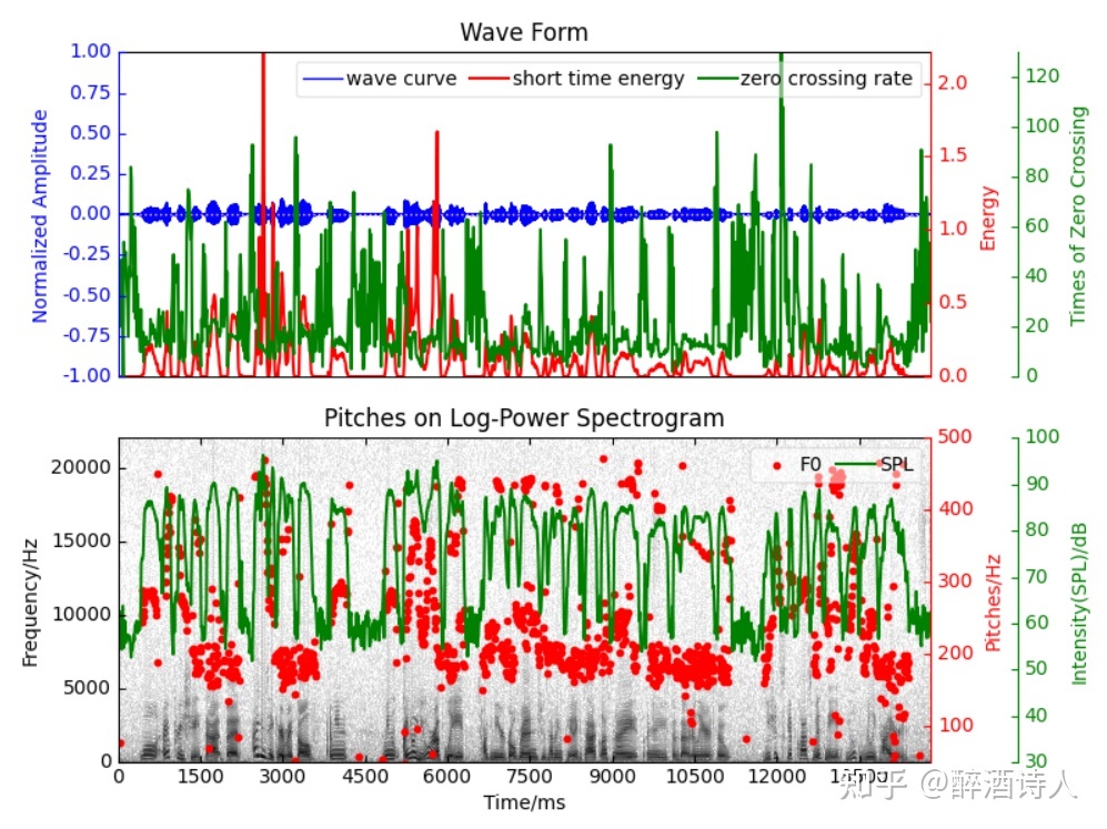 为了有一个直观的图来解释上述的理论,可以把语音波形、短时能量、声强级、过零率、音高绘制在一张图上,如下图 3 所示: