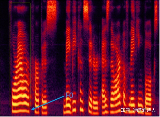 基音周期反映了声门相邻两次开闭之间的时间间隔,基频(fundamental frequency, F0)则是基音周期的倒数,对应着声带振动的频率,代表声音的音高,声带振动越快,基频越高。如图 2 所示,蓝色箭头指向的就是基频的位置,决定音高。它是语音激励源的一个重要特征,比如可以通过基频区分性别。一般来说,成年男性基频在 100-250Hz 左右,成年女性基频在 150-350Hz 左右,女声的音高一般比男声稍高。 人类可感知声音的频率大致在 20-20000Hz 之间,人类对于基频的感知遵循对数律,也就是说,人们会感觉 100Hz 到 200Hz 的差距,与 200Hz 到 400Hz 的差距相同。因此,音高常常用基频的对数来表示。