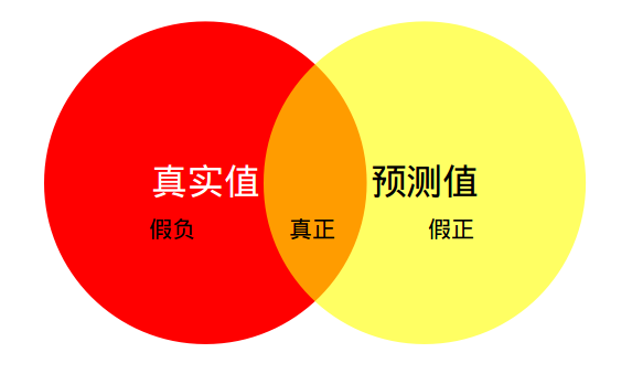 如下图所示,红色圆代表真实值,黄色圆代表预测值。橙色部分红色圆与黄色圆的交集,即真正(预测为1,真实值为1)的部分,红色部分表示假负(预测为0,真实为1)的部分,黄色表示假正(预测为1,真实为0)的部分,两个圆之外的白色区域表示真负(预测为0,真实值为0)的部分。
