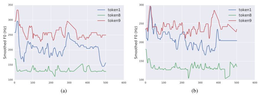 从图 2 中可以看出,”token 1” 大致对应于具有正常音高范围的马虎、草率(sloppy)风格,”token 8” 大致对应于机器人声音的风格,而 “token 9” 大致对应于高音调声音。这些风格在一定程度上反映在平滑的 F0 轨迹上。例如,”token 9” 倾向于比其他两个有更高的音调,而 “token 8” 的音调轨迹则保持平缓和低沉。同样的趋势可以从图 2(b) 中看出,该图是由不同的语句产生的,表明风格标记的运作独立于文本输入。