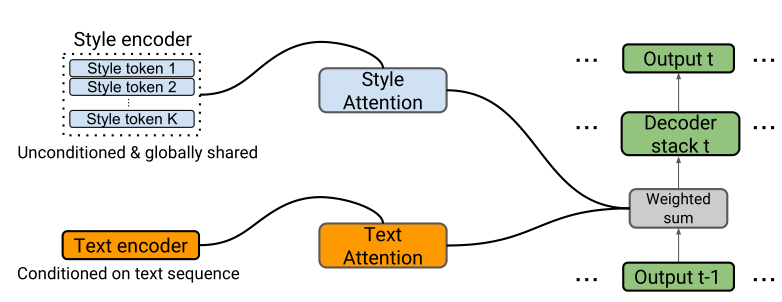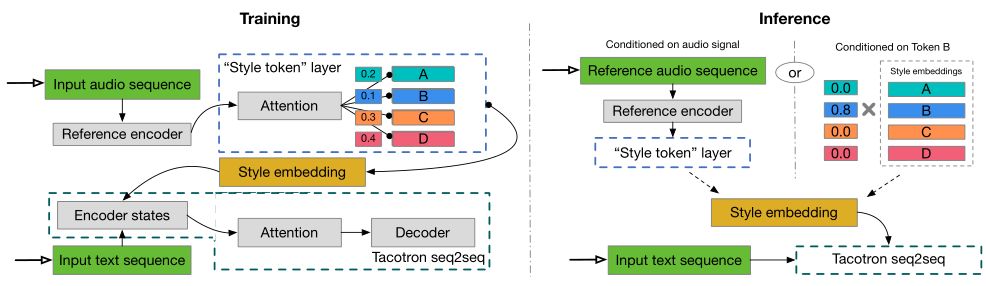 在这项工作中,作者引入了 “风格标记(style tokens)” 的概念,它可以被视为捕捉韵律变化的潜在变量,而单靠文本输入是无法捕捉的。