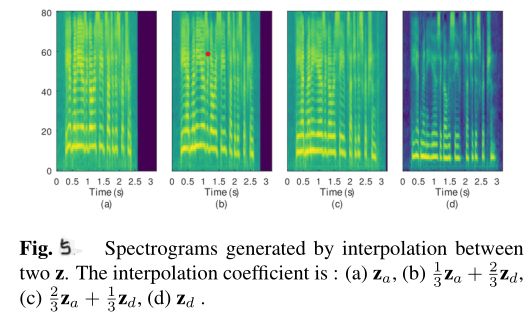 如图 5 所示,这两个 z 是通过向识别模型提供两个参考音频而得到的, $z_a$表示说话语速快和高音调, $z_d$表示说话语速慢和低音调。通过对这两个 z 的插值 interpolation 操作,可以看到生成的语音的音高和语速都在逐渐下降。这一结果表明,学习到的潜在空间在控制声谱图的趋势方面是连续的,这将进一步反映在风格的变化上。