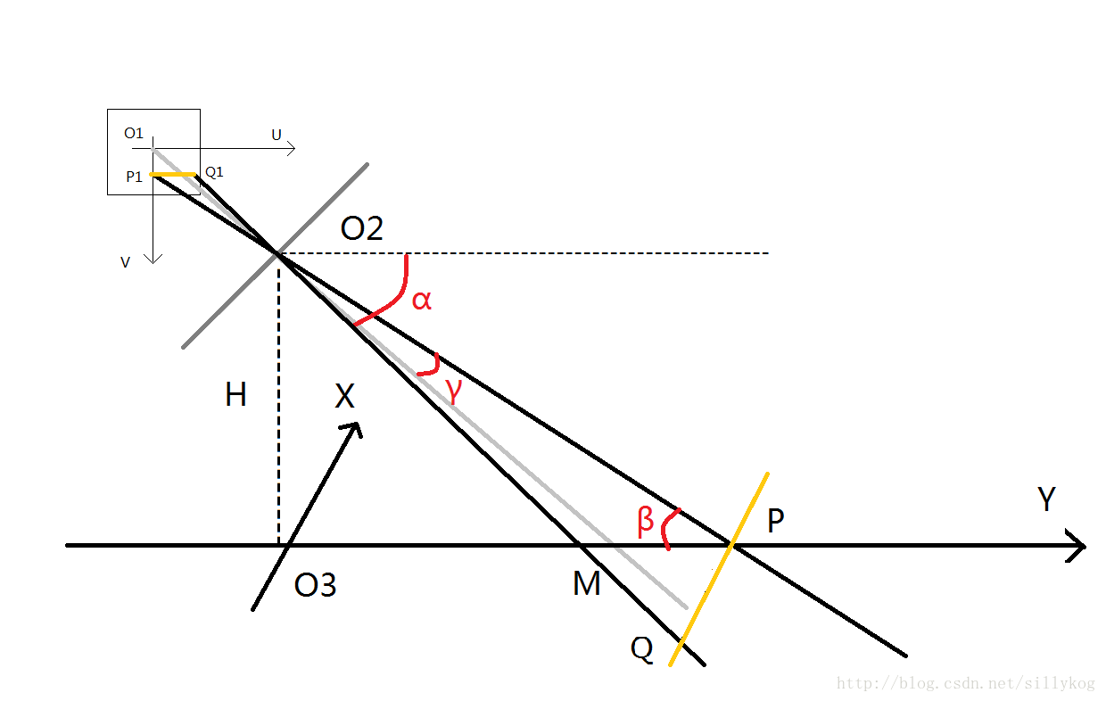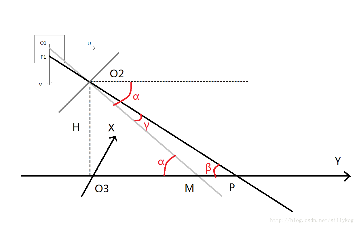 • 图像坐标中心对应的世界坐标点与摄像头在y轴上的距离$O_3M$