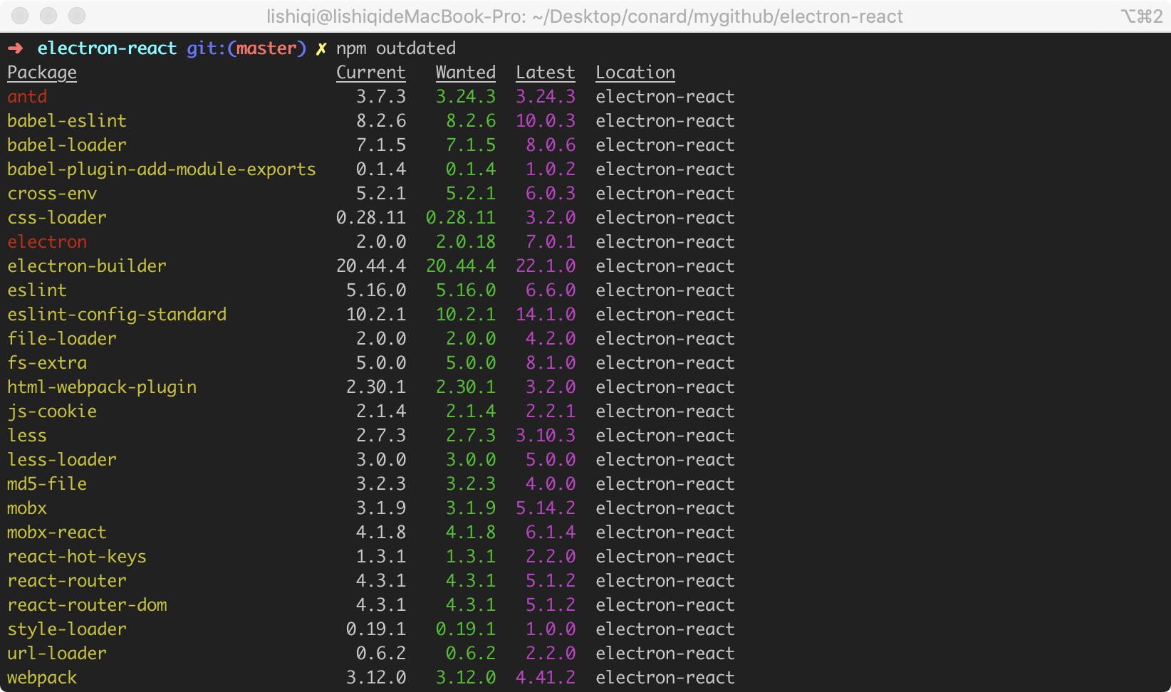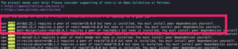 例如,我在项目中依赖了 antd 的最新版本,然后依赖了 react 的 15.6.0版本,在进行依赖安装时将给出以下警告: