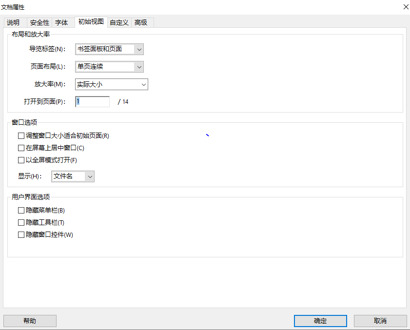 在文档属性中,找到初始视图,选择导航标签和放大率,设置如下: