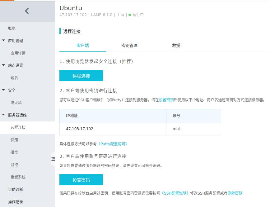 为了安全起见,我们需要点击服务器运维->远程连接->设置密码,设置好密码。