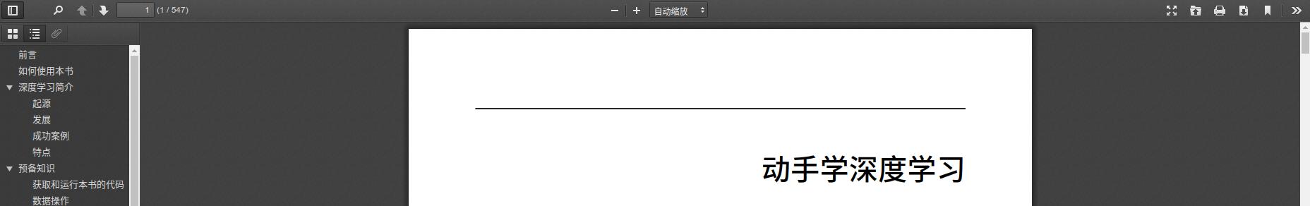 此时,就可以在浏览器输入http://47.103.17.102/PDF.js/web/viewer.html?file=d2l-zh.pdf访问这个PDF了。效果如下: