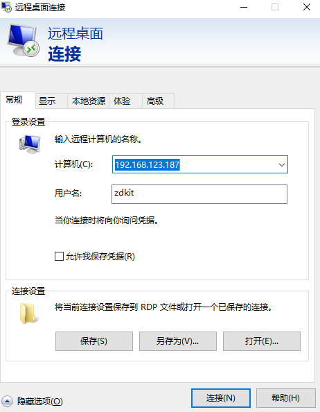 在另外一台装有windows的电脑,运行cmd,输入mstsc,输入IP地址192.168.123.187,用户名zdaiot,点击连接。如下所示