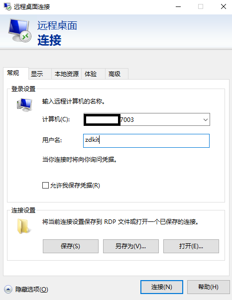 访问客户端远程桌面服务:在另外一台装有windows的电脑,运行cmd,输入mstsc,输入IP地址xxx.xx.xx.xx:7003或者www.xxx.com:7003,用户名zdaiot,点击连接。其中xxx.xx.xx.xx为你的服务器IP地址,www.xxx.com为指向服务端的域名。如下所示