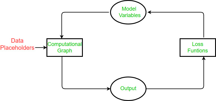 定义好以上的组成部分,我们就可以用流程化的方式将其组合起来,让系统对输入进行学习,调整参数。因为该系统的反馈机制,所以,组成的方式肯定需要循环。