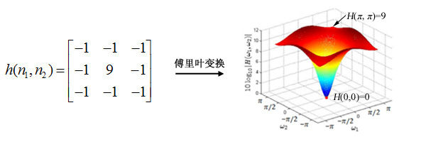 上面卷积核都是在频域进行解释的,这是为了探讨卷积的本质,这里补充一点在时域的解释:对于低通滤波器,就是将中心像素值与周围临近的像素进行平均,自然就能“削峰填谷”,实现平滑处理;对于高通滤波器,就是将中心像素值复制n份,然后减去周围的n个临近像素值。所以如果是在区域位置(四周像素值都很相近),像素值肯定就“减”为0;只有在边缘位置(与周围的像素值差别比较大),相减后才能留下。
