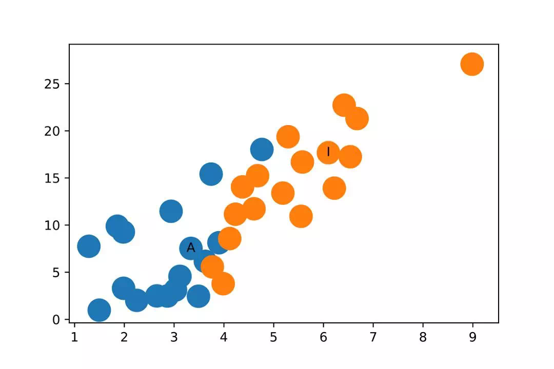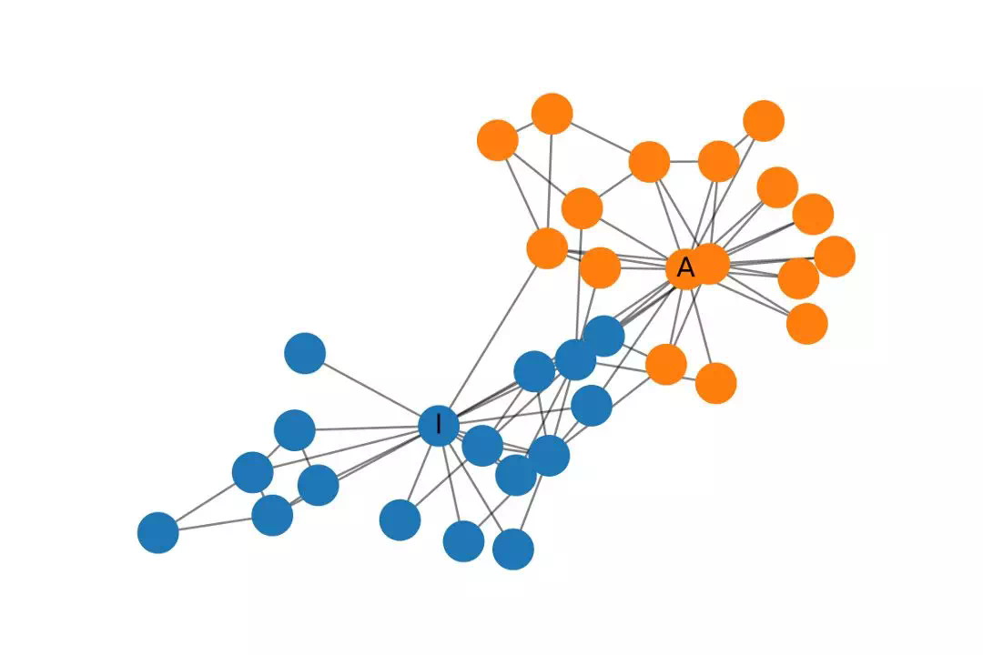 Zachary 空手道俱乐部是一个被广泛使用的社交网络,其中的节点代表空手道俱乐部的成员,边代表成员之间的相互关系。当年,Zachary 在研究空手道俱乐部的时候,管理员和教员发生了冲突,导致俱乐部一分为二。下图显示了该网络的图表征,其中的节点标注是根据节点属于俱乐部的哪个部分而得到的,「A」和「I」分别表示属于管理员和教员阵营的节点。