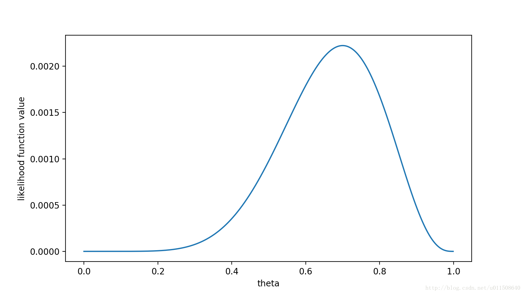 可以看出,在$θ=0.7$时,似然函数取得最大值。