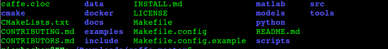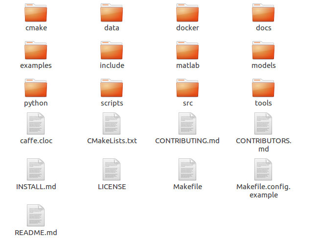 首先你需要从github上面clone或者下载.zip的压缩包。效果是一样的。然后你得到一个cafffe-master的压缩包或者文件夹。进到这个文件夹里面,你会看到是这个样子的。