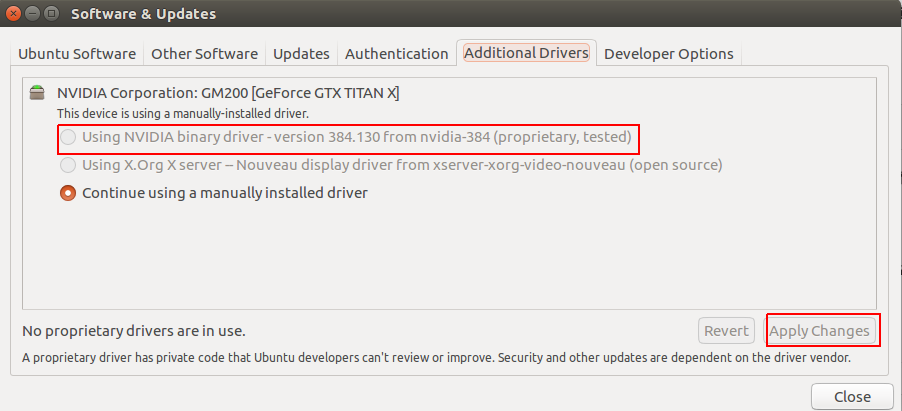 有的时候,利用离线安装驱动的方法会遇到莫名其妙的问题,可以试试System Setting中的驱动,如下图选择using NVIDIA binary driver选项(因为我这里已经手动安装过了,所以是灰色),然后点击Apply Changes。