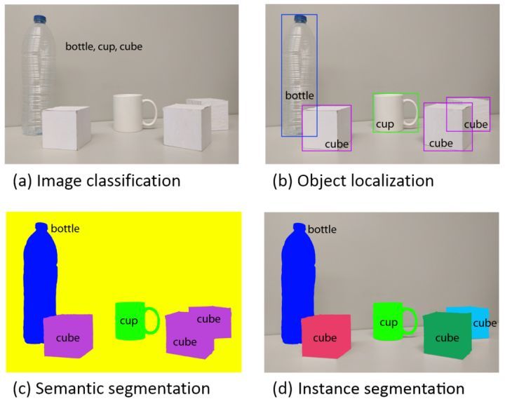计算机视觉旨在识别和理解图像/视频中的内容,包含四大基本任务:分类(图a)、定位、检测(图b)、语义分割(图c)、和实例分割(图d)。