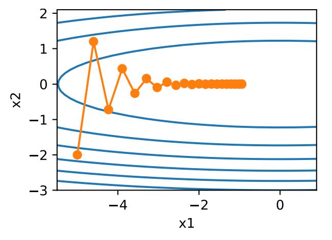 例如,在下面这个图中,可以看到,同一位置上,目标函数在竖直方向(x2轴方向)比在水平方向(x1轴方向)的斜率的绝对值更大。因此,给定学习率,梯度下降迭代自变量时会使自变量在竖直方向比在水平向移动幅度更大。那么,我们需要一个较小的学习率从而避免自变量在竖直方向上越过目标函数最优解。然而,这会造成自变量在水平方向上朝最优解移动变慢。