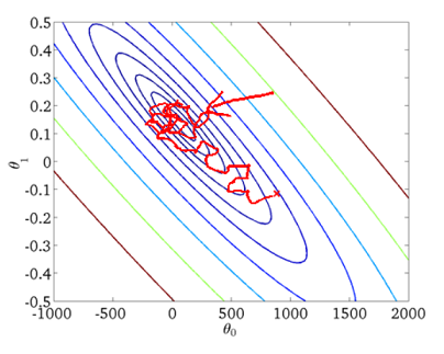 随机梯度下降是通过每个样本来迭代更新一次,如果样本量很大的情况(例如几十万),那么可能只用其中几万条或者几千条的样本,就已经将$\theta$迭代到最优解了,对比上面的批量梯度下降,迭代一次需要用到十几万训练样本,一次迭代不可能最优,如果迭代10次的话就需要遍历训练样本10次。但是,SGD伴随的一个问题是噪音较BGD要多,使得SGD并不是每次迭代都向着整体最优化方向。