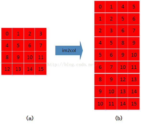 原图(图a)按照从左到右、从上到下的过程,将(a)中大小为3*3(因为kernel大小为3*3)的矩阵拉成右图(图b)中的一列。具体过程如下图所示: