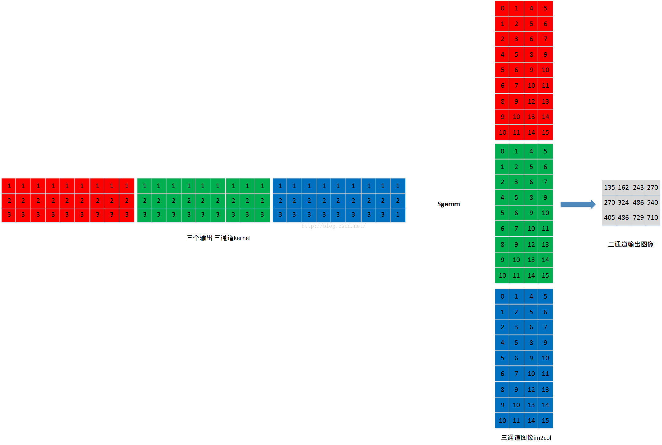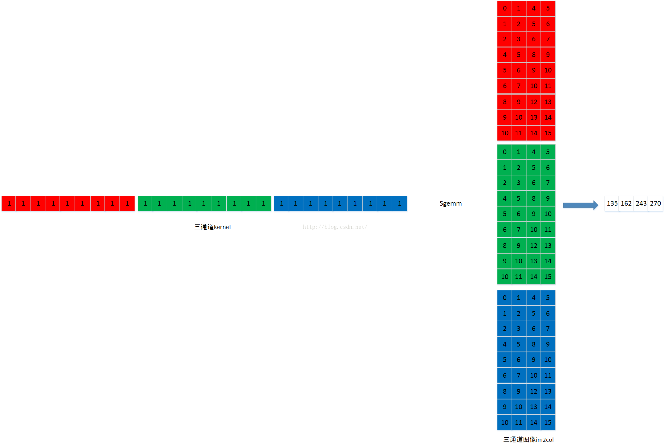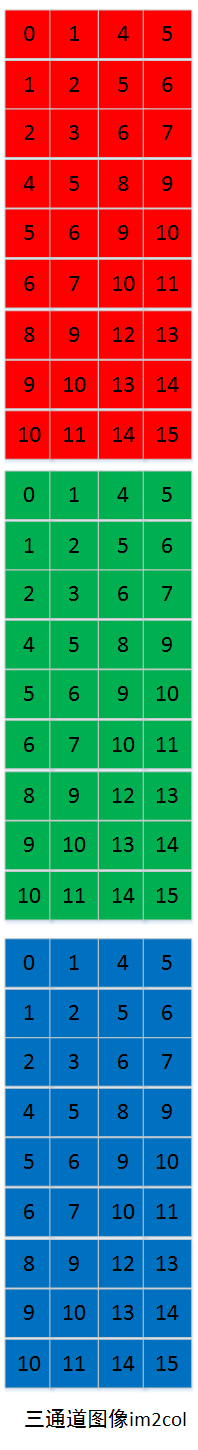 多通道的im2col的过程,是首先im2col第一通道,然后在im2col第二通道,最后im2col第三通道。各通道im2col的数据在内存中也是连续存储的。如下图: