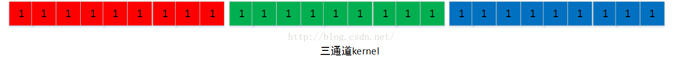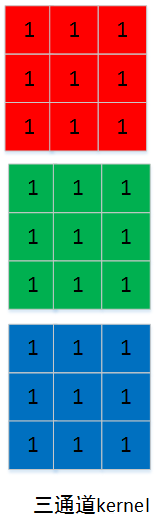 图像的每个通道对应一个kernel通道,如下图(注:为计算简单,将kernel的值设置为1,同样此值不代表颜色数值。)