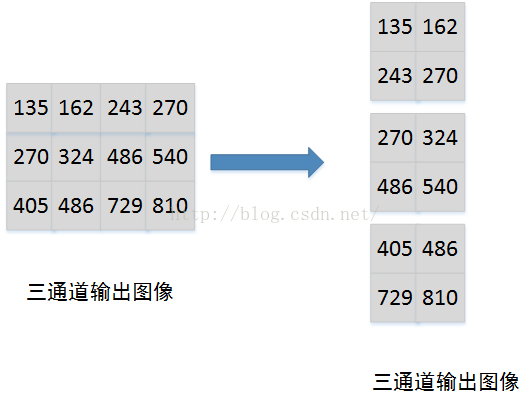 同样,多个输出通道图像的数据是连续存储,因此输出图像也可以如下图所示【output_channels*output_h * output_w】=【3*2*2】,