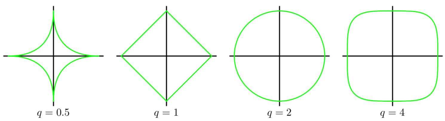 而之前已经说明,q的含义是一般化正则项的幂指数,也就是我们常说的2范数,两者在形式上是完全等同的。结合范数的定义,我们可以解释一般化正则项为一种对待求参数 $\mathbf w$ 的测度,可以用来限制模型不至于过于复杂