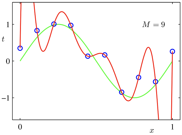 可以看到二次正则项的优势,处处可导,方便计算,限制模型的复杂度,即 $\mathbf w$ 中M的大小,M是模型的阶次,M越大意味着需要决定的权重越多,所以模型越复杂。在多项式模型多,直观理解是每一个不同幂次的 $x$ 前的系数,0(或很小的值)越多,模型越简单。这就从数学角度解释了,为什么正则化(规则化)可以限制模型的复杂度,进而避免过拟合