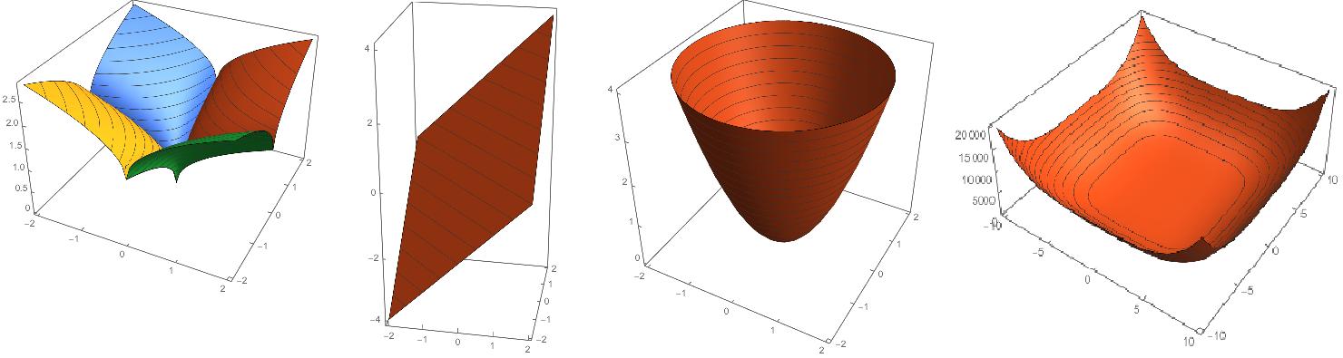 若q=2就是二次正则项。高维度没有图像表征非常难以理解,那就使用二维作为特例来理解。这里令M=2,即$\mathbf x =\{x_1,x_2\} \;\mathbf w=\{w_1,w_2\}$ ,令q=0.5 q=1 q=2 q=4 有