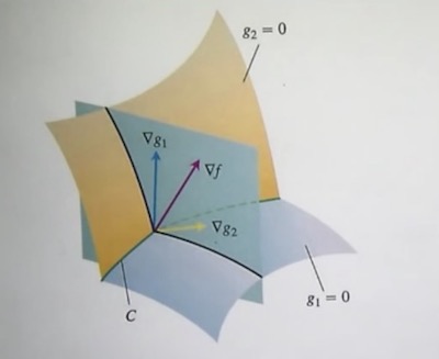 往更高纬度走的话,多约束条件的情况下,问题变为了$g_1,g_2$ 围成的曲线$C$ 和$f$ 相切,直观上看$\nabla f$ 必然在$\nabla g_1,\nabla g_2$ 张成的空间中: