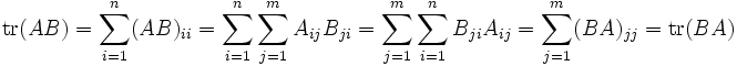 利用这个结果,我们可以推导出方阵的乘积和其任何循环置换的乘积会有相同的迹,称为迹的“循环性质”。例如,有三个方阵A、B、C,则: