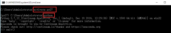 在Windows系统中,通过activate py27和deactivate py27命令激活、退出该环境。