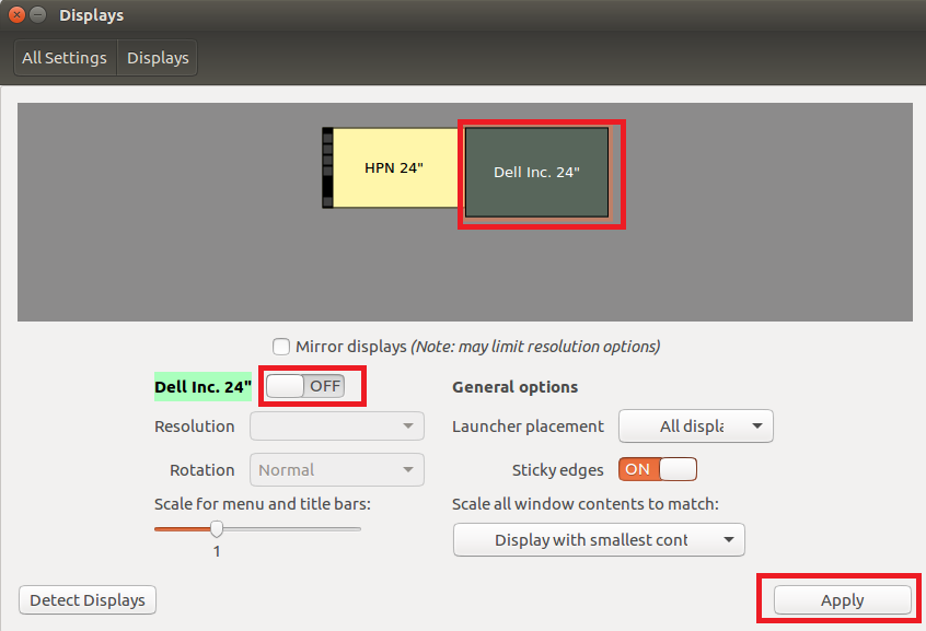 这个时候,在Ubuntu下打开Settings->DisPlays,点击主显示器,例如我这里的主显示器为Dell Inc. 24'',然后点击下图的红框,将其状态设置为OFF,点击Apply即可。