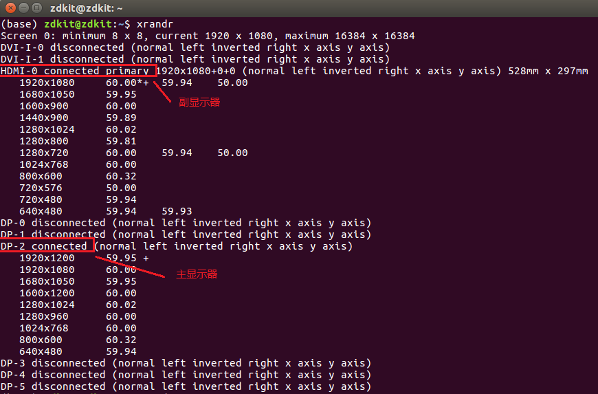 在终端输入xrandr指令,查看当前的显示信息。例如下图HDMI-0为我的副显示器,DP-2为主线器。