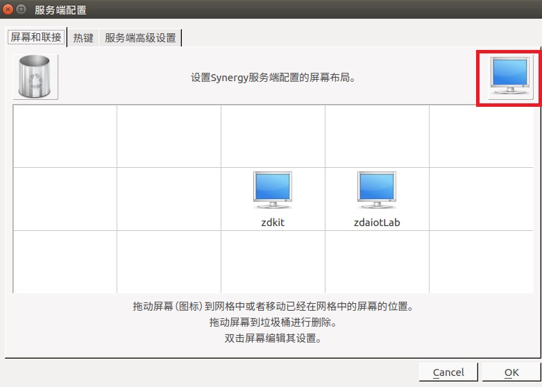 若此时直接开启服务端和客户端,则提示说WARNING: unrecognised client name "zdaiotLab", check server config,此时需要在服务器端,点击设置服务端。在弹出的界面,拖红框中的图标到下方的方格中,如下图所示。