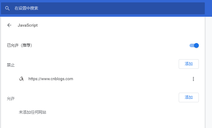 在浏览器输入chrome://settings/content/javascript,例如禁用cnblog的js,就可以禁用掉markdown公式渲染: